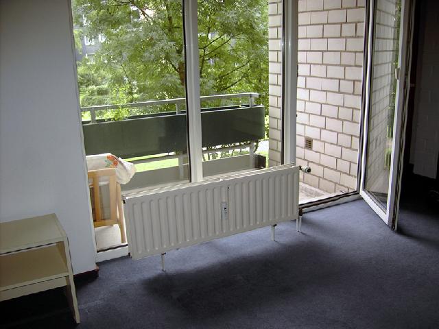 Es verf?gt ?ber eine separate Diele, einen direkt angrenzenden Abstellraum, ein wei? gefliestes Duschbad und eine Pantryk?che. Sie enth?lt einen K?hlschrank mit Gefrierfach, zwei Elektrokochplatten und eine Sp?le. Blauer Teppichboden. Durch gro?e Glasfensterfl?chen und Balkont?r erhellt. Balkon zur Gr?nanlage. Zus?tzlicher Kellerraum.